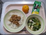 今日の給食:豚肉丼、青梗菜と豆腐のスープ、冷凍みかん、牛乳
