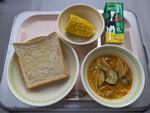 今日の給食:ガーリックトースト、トマトのスープスパゲッティ、蒸しとうもろこし、牛乳