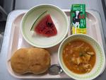 今日の給食:ソフトフランスパン、ポークシチュー、すいか、牛乳