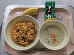 今日の給食:ジャンバラヤ、あさりのチャウダー、バナナ、牛乳