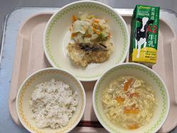 今日の給食:ごはん、メルルーサのピリ辛ソースかけ、ゆで野菜、かきたまスープ、牛乳