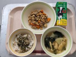今日の給食:ごはん、ふりかけ、鶏肉と大豆の煮物、味噌汁、牛乳