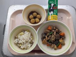 今日の給食:さつまいもごはん、炒り鶏、みたらしだんご、牛乳