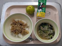 今日の給食:豚丼、味噌汁、みかん、牛乳