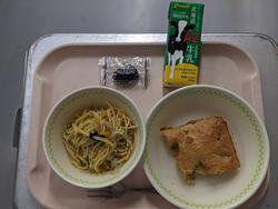 今日の給食:藤沢たっぷりペペロンチーノ、りんごとさつまいものケーキ、プルーン、牛乳