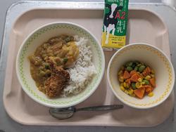 今日の給食:カツカレーライス、三色ソテー、牛乳
