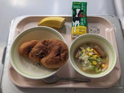 今日の給食:あげパン、ウィンナーと野菜のスープ煮、バナナ、牛乳