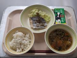 今日の給食:ごはん(藤沢新米)、太刀魚の香味ソースかけ、ゆで野菜、せんべい汁、牛乳