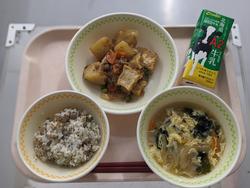 今日の給食:じゃこごはん、生揚げと野菜のそぼろ煮、かんぴょうの卵とじ汁、牛乳