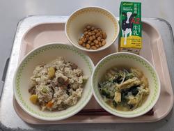今日の給食:吹き寄せおこわ、ぶどう豆、みそ汁、牛乳