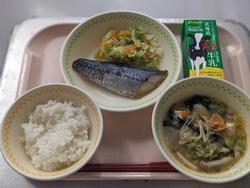 今日の献立:ごはん、さわらの照り焼き、ゆで野菜、豚汁、牛乳