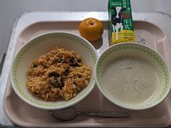 今日の給食:チキンライス、豆のポタージュ、みかん、牛乳