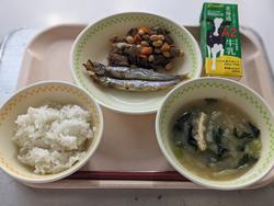 今日の給食:ごはん、ししゃもの干物、大豆の五目煮、味噌汁、牛乳