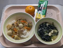 今日の給食:中華丼、豆腐とわかめのスープ、みかん、牛乳