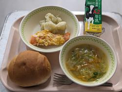 今日の給食:ロールパン、鮭のマヨネーズ焼き、粉ふきいも、ジュリアンスープ