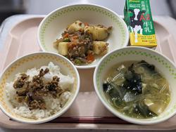 今日の給食:ごはん、あさりの佃煮、あげじゃがいものそぼろ煮、みそ汁、牛乳