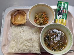 今日の給食:ソフト麺カレー南蛮、おかかあえ、ベイクドチーズケーキ、牛乳