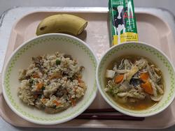今日の給食:五目ごはん・きのこ汁・バナナ・牛乳