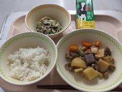 今日の給食:ごはん(合鴨米)・筑前煮・煮びたし・牛乳