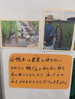 1つ目が農薬を使わない代わりに合鴨を田に放って育てた合鴨米です。下の写真は毎日給食当番に見てもらう栄養黒板の一部です。