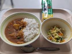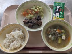 今日の給食:ごはん、かつおのごまがらめ、ゆで野菜、さつま汁、牛乳