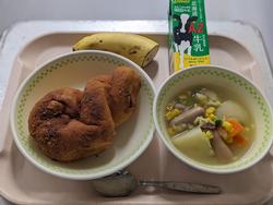 今日の給食:あげパン、ウインナーと野菜のスープ煮、バナナ、牛乳