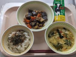 今日の給食:ごはん、ふりかけ、炒り鶏、かきたま汁、牛乳
