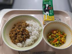 今日の給食:ドライカレー、三色ソテー、牛乳