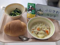 今日は地産地消食材がたっぷりのふじさわランチです。藤沢産のお米、さつま芋、長ねぎ、小松菜にくわえ、神奈川県産の大根ともやしも届きました!