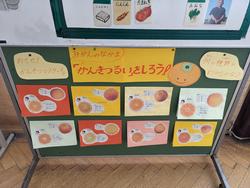 フルーツは清見オレンジです。3学期はいよかん、せとかなど様々な柑橘類が出てくる予定なのでぜひ違いを知ってほしいと思い給食室前に掲示を用意しました。