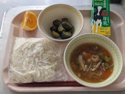 今日の給食:ソフトめん五目あんかけ、きゅうりの香りづけ、清見、牛乳