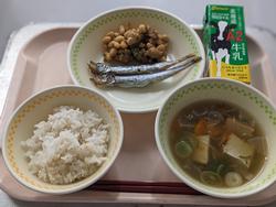 今日の給食:ごはん、ししゃもの干物、鶏肉と大豆の煮物、のっぺい汁、牛乳