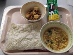 今日の給食:ソフト麺かきたまうどん、まめまめみそ豆、牛乳