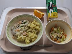 今日の給食:カレーピラフのクリームソースかけ、野菜炒め、清見、牛乳