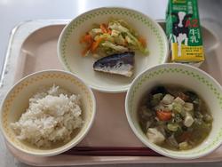 今日の献立:ごはん、さばの味噌煮、ゆで野菜、けんちん汁、牛乳