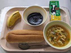 今日の給食:ふじさわコッペパン、黒ごまあん、すいとん汁、バナナ、牛乳