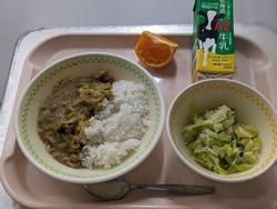 今日の給食:みどりんカレーライス、キャベツとしらすのソテー、せとか、牛乳
