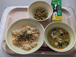 今日の給食:五目ずし、しょうゆ豆、吉野汁、牛乳