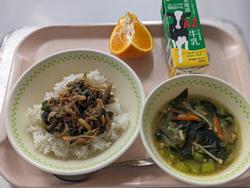 今日の給食:ビビンバ、わかめスープ、しらぬひ、牛乳