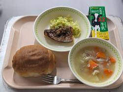 今日の給食:米粉ロールパン、太刀魚の香味ソースかけ、ゆで野菜、豆と野菜のスープ、牛乳