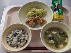 今日の給食:わかめごはん、鶏肉のからあげ、ゆで野菜、みそ汁、牛乳