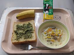 今日の給食:しらすトースト、クリームスープスパゲッティ、バナナ、牛乳