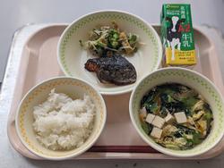 今日の給食:ごはん、さわらの照り焼き、煮びたし、かきたま汁、牛乳