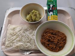 今日の給食:ソフト麺ミートソース、じゃがバタベーコン、牛乳
