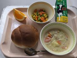 今日の給食:ロールパン、三色ソテー、ホワイトシチュー、清見、牛乳