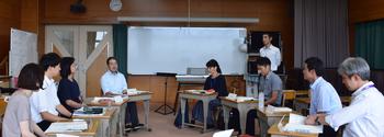 研究協議会では、「友だちの解き方を聞いて終わることが多い中、意図的に友だちの解き方でやってみる機会を設け、実際に生徒が良さを実感する様子を見られてよかった。」という感想が寄せられました。講師の池田先生からは、分からないで止まってしまうのではなく生徒皆がはじめの一歩を踏み出せる授業になっていたこと、同じ共通画面を見て決まりを見つけるプロセスを伝え合い皆で学び合う大切さについて、お話しをいただきました。